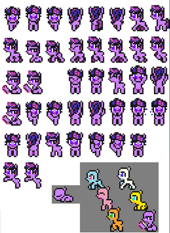 8-way 32x32 sprites with a dozen animations, 16x16 sprites, a Final Fantasy 6 style Twilight Sparkle (16x24), a Final Fantasy 1 battle sprite style (consider it cosplay), a 32x32 G1-style pony sprite with many animations.